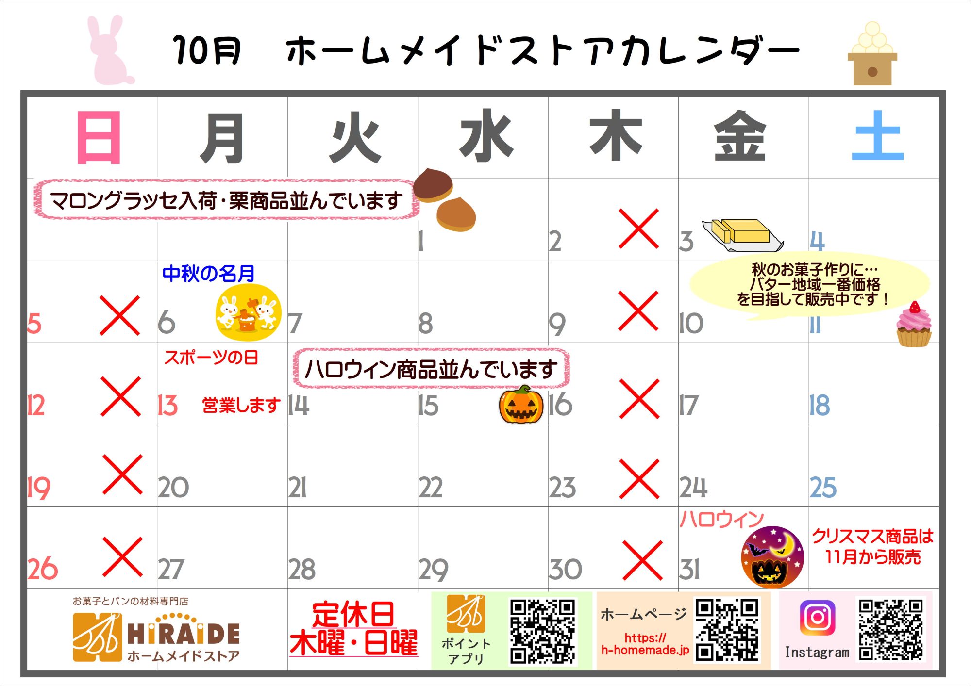 10月カレンダー 2025.09.23 ブログ 営業日カレンダー 2025年10月営業カレンダーです。 ・マロングラッセなど栗商品が店頭に並んでいます。・ハロウィン商品が並んでいます。 ※クリスマス商品は11月から販売します。 ハロウィンマフィンを作ろう👻 かぼちゃのバスクチーズケーキ