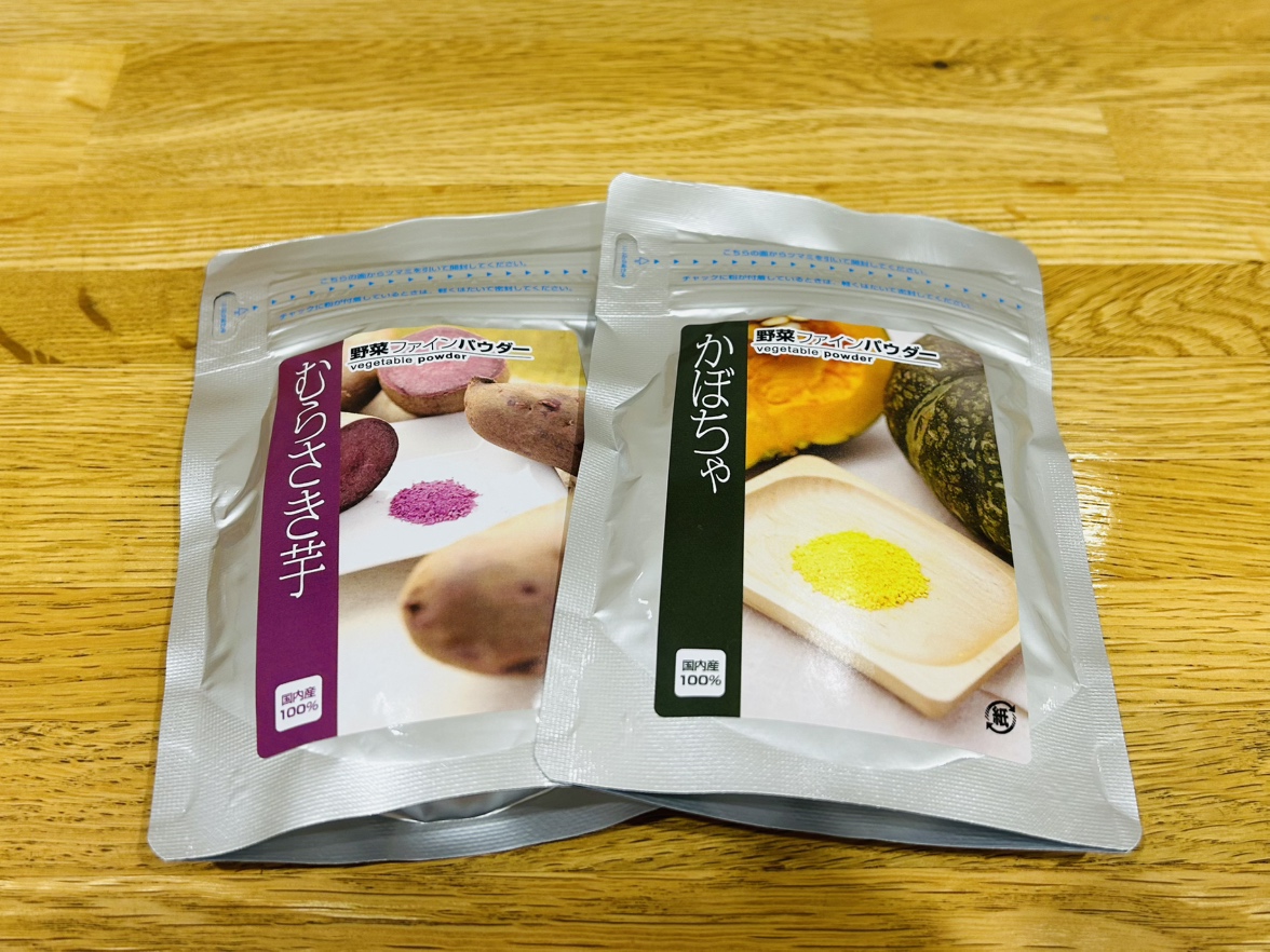 そんな時活躍なのが、野菜パウダー。ハロウィンカラーにはかぼちゃとむらさきいもがピッタリです。